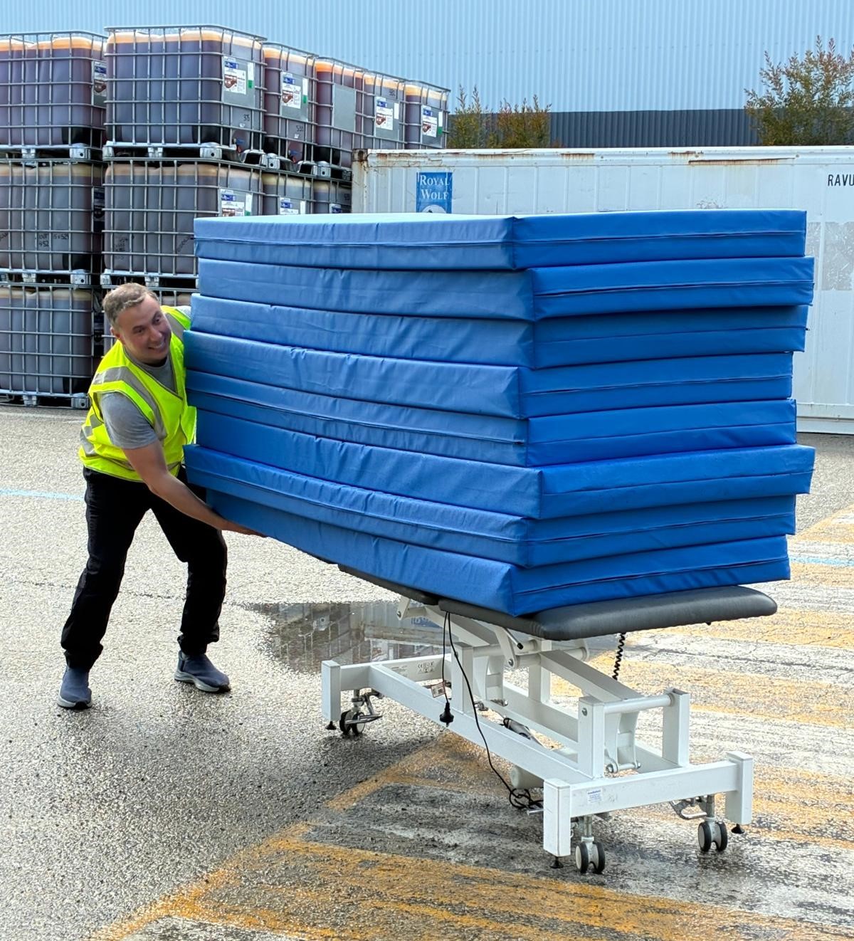 Nearly 250 items were loaded including hospital beds, mattresses, examination tables, birthing bed, ENT microscope, operating table, PPE, scrubs, anaesthetic equipment, crutches, wheelchairs for disabled children, and theatre/medical supplies.